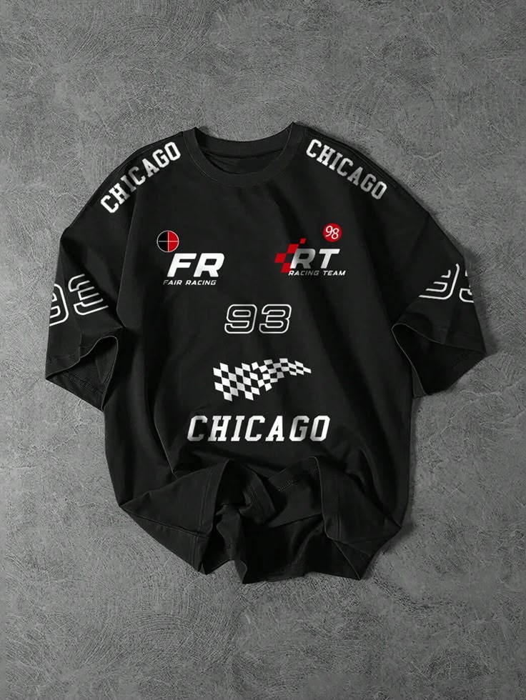 & Free ShippingAggressive oversized black graphic T-shirt featuring multiple racing-inspired prints: “CHICAGO” shoulder text, “FR/RT” racing logos, and a “93” patch.